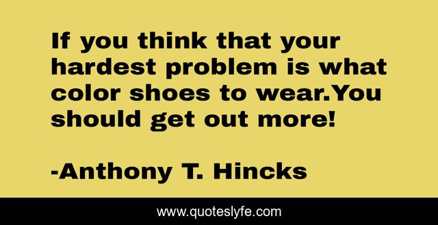 This page presents the quote "If you think that your hardest problem is what color shoes to wear.You should get out more!". Author of this quote is Anthony T. Hincks. This quote is about get-out, life, hard, get, philosophy, hardest, problem, more, think,.