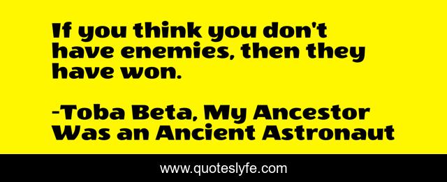 This page presents the quote "If you think you don't have enemies, then they have won.". Author of this quote is Toba Beta, My Ancestor Was an Ancient Astronaut. This quote is about invisible, enemy, perception, invincible, win,.