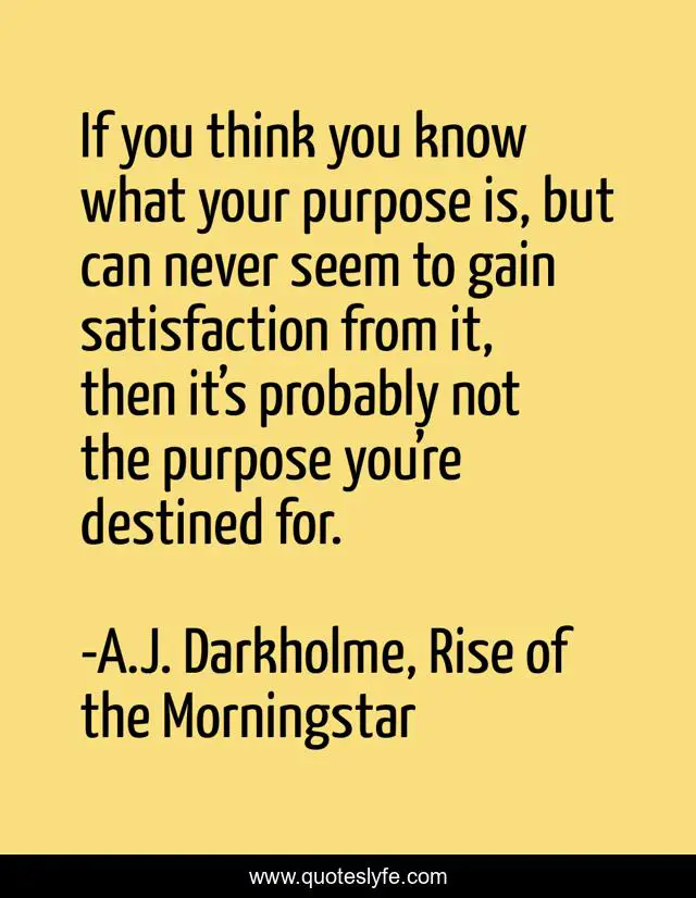 This page presents the quote "If you think you know what your purpose is, but can never seem to gain satisfaction from it, then it’s probably not the purpose you’re destined for.". Author of this quote is A.J. Darkholme, Rise of the Morningstar. This quote is about life, uncertainty, self-awareness, destiny, choice, insight, soul-searching, searching, pursuits,.