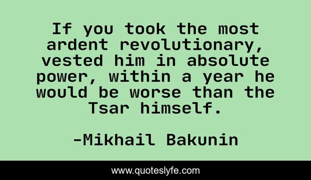 This page presents the quote "If you took the most ardent revolutionary, vested him in absolute power, within a year he would be worse than the Tsar himself.". Author of this quote is Mikhail Bakunin. This quote is about lenin, anarchism, chomsky, libertarianism, libertarian-socialism, state-socialism, marxism, leninism, communism-patriotism-inspiration,.