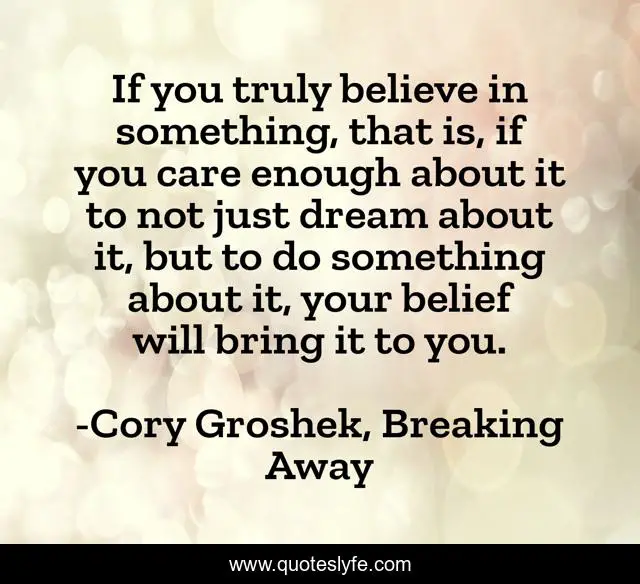 This page presents the quote "If you truly believe in something, that is, if you care enough about it to not just dream about it, but to do something about it, your belief will bring it to you.". Author of this quote is Cory Groshek, Breaking Away. This quote is about belief, believe-and-achieve, dreaming, dreaming-big, believe-in-yourself, believe, dream, beliefs, care,.