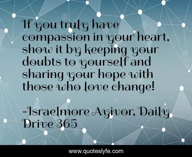 This page presents the quote "If you truly have compassion in your heart, show it by keeping your doubts to yourself and sharing your hope with those who love change!". Author of this quote is Israelmore Ayivor, Daily Drive 365. This quote is about make-a-change, heart, food-for-thought, empathy, change-lovers, compassion, compassionate, share, israelmore-ayivor,.