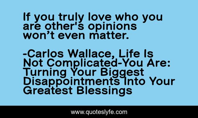 This page presents the quote "If you truly love who you are other's opinions won’t even matter.". Author of this quote is Carlos Wallace, Life Is Not Complicated-You Are: Turning Your Biggest Disappointments Into Your Greatest Blessings. This quote is about life, self-esteem, carlos-wallace, self-improvement, self-help,.
