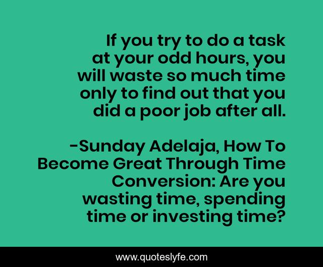 This page presents the quote "If you try to do a task at your odd hours, you will waste so much time only to find out that you did a poor job after all.". Author of this quote is Sunday Adelaja, How To Become Great Through Time Conversion: Are you wasting time, spending time or investing time?. This quote is about life, conversion, productivity, wealth, greatness, waste, humanity, product, odd-time,.