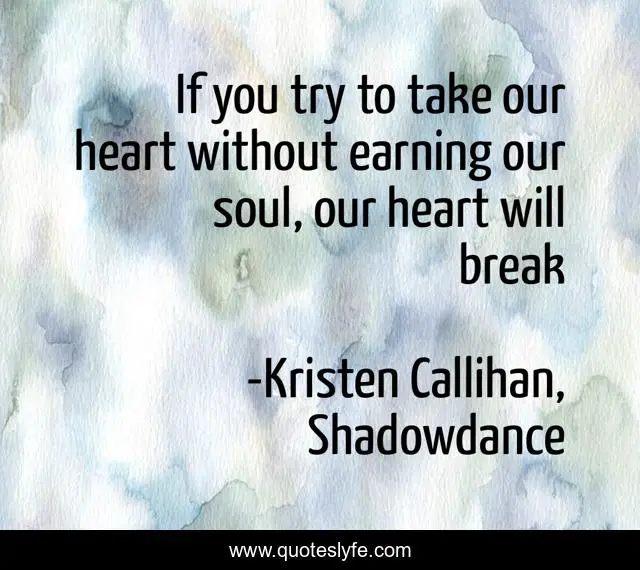 This page presents the quote "If you try to take our heart without earning our soul, our heart will break". Author of this quote is Kristen Callihan, Shadowdance. This quote is about heart, love, take-her-heart, soul, break, fantasy, shadow, earning, affection,.