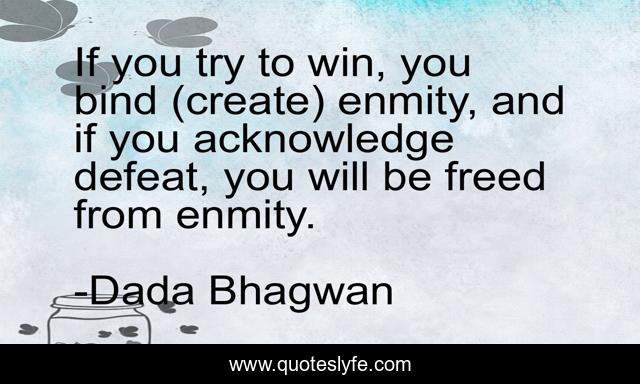 This page presents the quote "If you try to win, you bind (create) enmity, and if you acknowledge defeat, you will be freed from enmity.". Author of this quote is Dada Bhagwan. This quote is about spiritual, how-to-be-free-from-enmity,.
