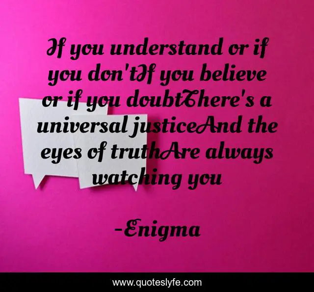 This page presents the quote "If you understand or if you don'tIf you believe or if you doubtThere's a universal justiceAnd the eyes of truthAre always watching you". Author of this quote is Enigma. This quote is about music, enigma,.