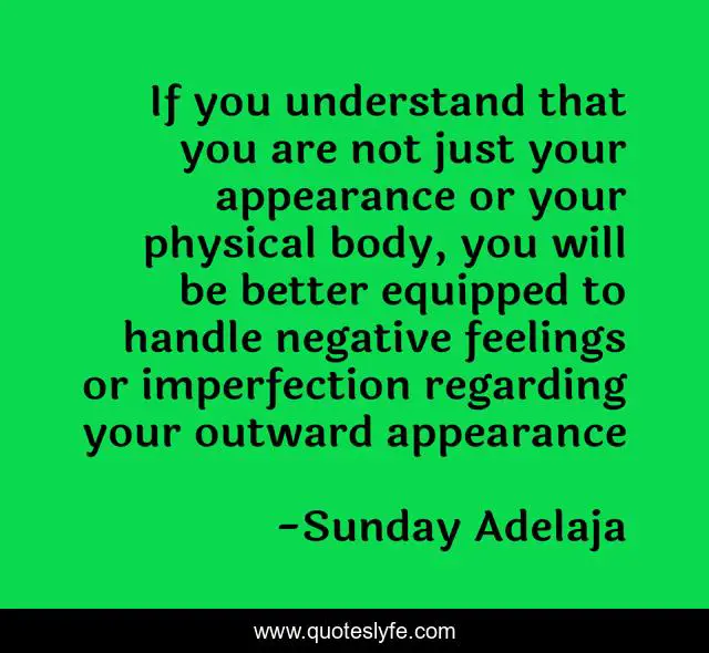 This page presents the quote "If you understand that you are not just your appearance or your physical body, you will be better equipped to handle negative feelings or imperfection regarding your outward appearance". Author of this quote is Sunday Adelaja. This quote is about body, physical-body, life, people, appearance, imperfection, understanding, perfection, truth,.