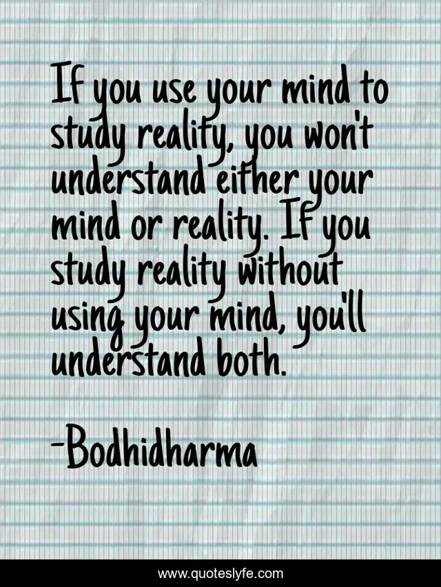 This page presents the quote "If you use your mind to study reality, you won't understand either your mind or reality. If you study reality without using your mind, you'll understand both.". Author of this quote is Bodhidharma. This quote is about mind, reality,.