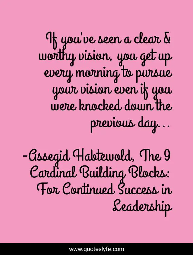 This page presents the quote "If you've seen a clear & worthy vision, you get up every morning to pursue your vision even if you were knocked down the previous day...". Author of this quote is Assegid Habtewold, The 9 Cardinal Building Blocks: For Continued Success in Leadership. This quote is about setbacks, knocked-down, pursue, endure, persist, vision,.