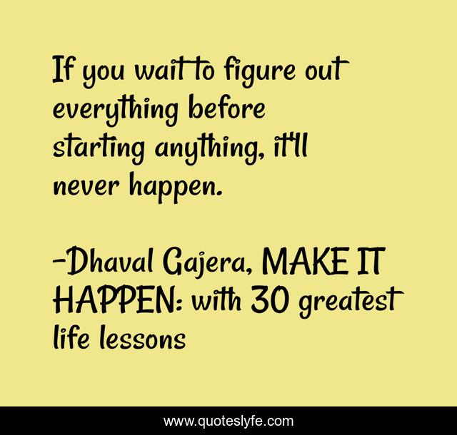 This page presents the quote "If you wait to figure out everything before starting anything, it'll never happen.". Author of this quote is Dhaval Gajera, MAKE IT HAPPEN: with 30 greatest life lessons. This quote is about everything, start, waiting, figure-out, happen, wait,.