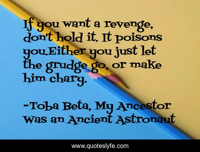 This page presents the quote "If you want a revenge, don't hold it. It poisons you.Either you just let the grudge go, or make him chary.". Author of this quote is Toba Beta, My Ancestor Was an Ancient Astronaut. This quote is about let-it-go, revenge, do-it,.