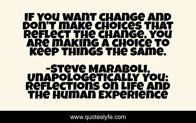This page presents the quote "If you want change and don’t make choices that reflect the change, you are making a choice to keep things the same.". Author of this quote is Steve Maraboli, Unapologetically You: Reflections on Life and the Human Experience. This quote is about life, let-go, change, choices,.