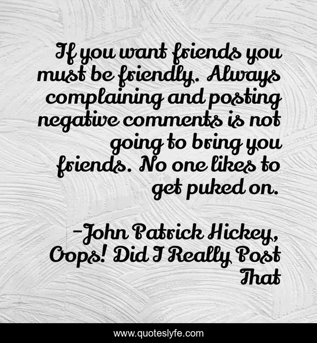 This page presents the quote "If you want friends you must be friendly. Always complaining and posting negative comments is not going to bring you friends. No one likes to get puked on.". Author of this quote is John Patrick Hickey, Oops! Did I Really Post That. This quote is about etiquette, social-media, success, civility, manners, personal-development, kindness,.