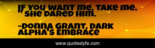 This page presents the quote "If you want me, take me, " she dared him.". Author of this quote is Donna Grant, Dark Alpha's Embrace. This quote is about death, fae, reapers, karma, paranormal-romance,.