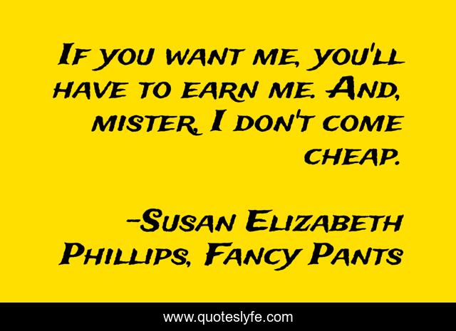 This page presents the quote "If you want me, you'll have to earn me. And, mister, I don't come cheap.". Author of this quote is Susan Elizabeth Phillips, Fancy Pants. This quote is about self-esteem, worthy,.