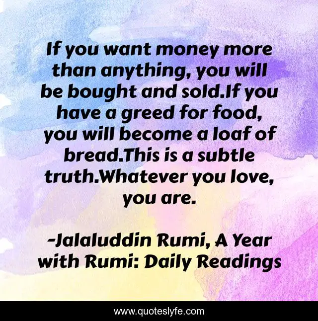 This page presents the quote "If you want money more than anything, you will be bought and sold.If you have a greed for food, you will become a loaf of bread.This is a subtle truth.Whatever you love, you are.". Author of this quote is Jalaluddin Rumi, A Year with Rumi: Daily Readings. This quote is about love, belief, poetry, fact, truth, believe, affection,.