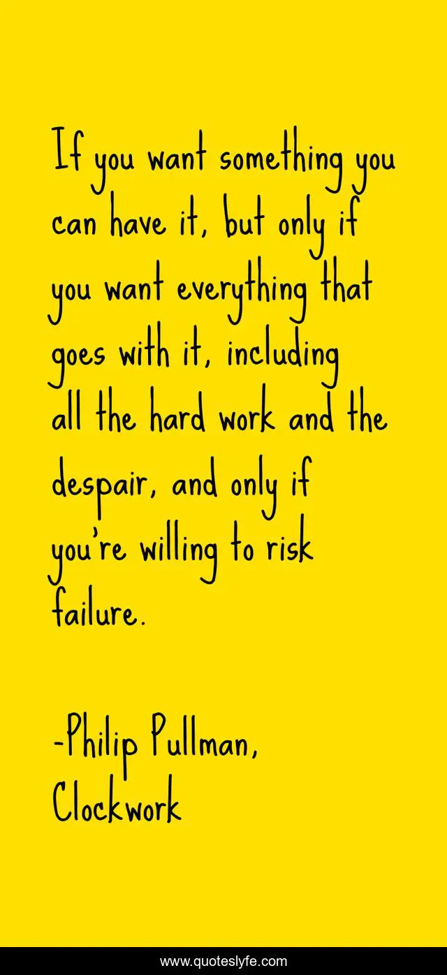 This page presents the quote "If you want something you can have it, but only if you want everything that goes with it, including all the hard work and the despair, and only if you're willing to risk failure.". Author of this quote is Philip Pullman, Clockwork. This quote is about enthusiasm, life, inspirational,.