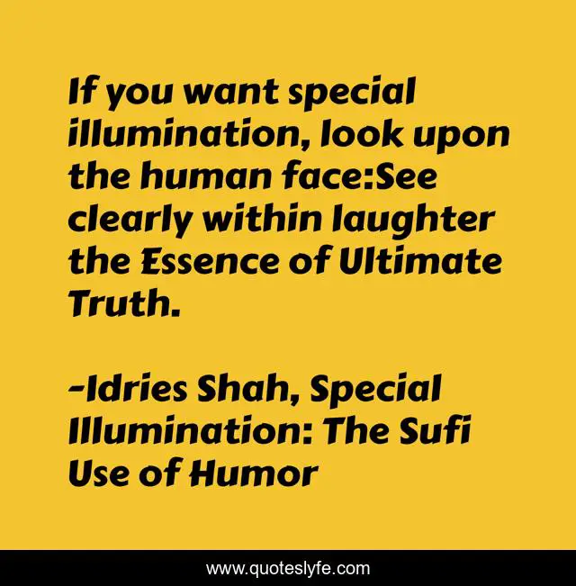 This page presents the quote "If you want special illumination, look upon the human face:See clearly within laughter the Essence of Ultimate Truth.". Author of this quote is Idries Shah, Special Illumination: The Sufi Use of Humor. This quote is about rumi, enlightenment, humour, wisdom, sufism, sufis,.