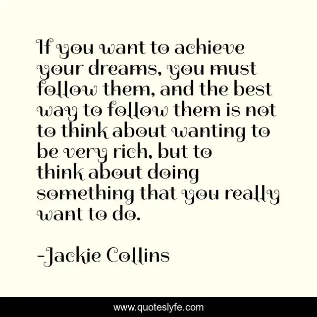 This page presents the quote "If you want to achieve your dreams, you must follow them, and the best way to follow them is not to think about wanting to be very rich, but to think about doing something that you really want to do.". Author of this quote is Jackie Collins. This quote is about your dreams, best, rich,.