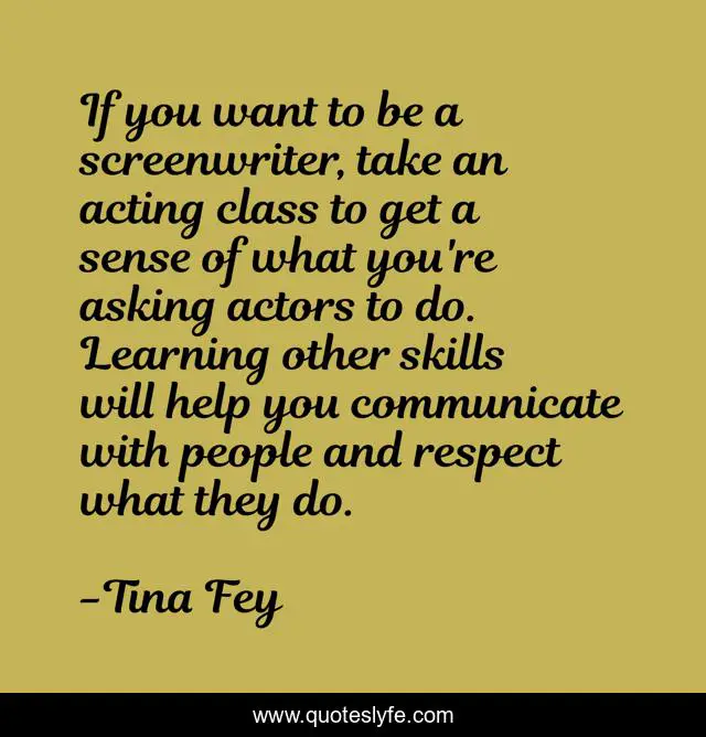 This page presents the quote "If you want to be a screenwriter, take an acting class to get a sense of what you're asking actors to do. Learning other skills will help you communicate with people and respect what they do.". Author of this quote is Tina Fey. This quote is about help, learning, people,.