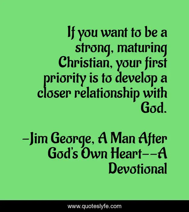 This page presents the quote "If you want to be a strong, maturing Christian, your first priority is to develop a closer relationship with God.". Author of this quote is Jim George, A Man After God's Own Heart--A Devotional. This quote is about relationships, jim-george, god, god-s-heart, christianity, priority, mature, strong,.