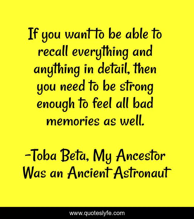 This page presents the quote "If you want to be able to recall everything and anything in detail, then you need to be strong enough to feel all bad memories as well.". Author of this quote is Toba Beta, My Ancestor Was an Ancient Astronaut. This quote is about feelings, memory,.