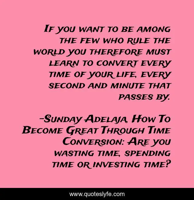 This page presents the quote "If you want to be among the few who rule the world you therefore must learn to convert every time of your life, every second and minute that passes by.". Author of this quote is Sunday Adelaja, How To Become Great Through Time Conversion: Are you wasting time, spending time or investing time?. This quote is about life, rule, conversion, productivity, wealth, greatness, waste, humanity, product,.