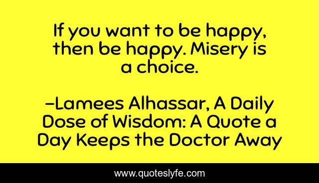 This page presents the quote "If you want to be happy, then be happy. Misery is a choice.". Author of this quote is Lamees Alhassar, A Daily Dose of Wisdom: A Quote a Day Keeps the Doctor Away. This quote is about inspirational-attitude, inspirational-life, lamees-alhassar, lamees,.
