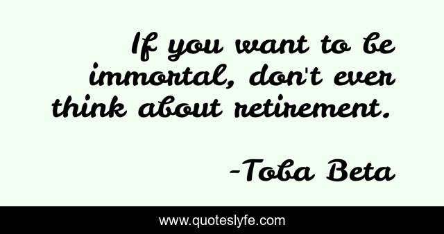 This page presents the quote "If you want to be immortal, don't ever think about retirement.". Author of this quote is Toba Beta. This quote is about eternity, immortality, eternal, immortal,.