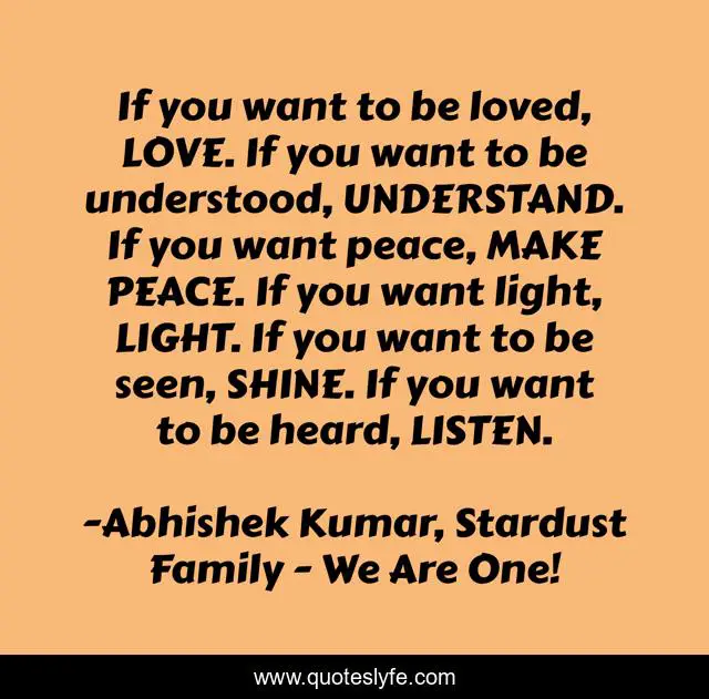 This page presents the quote "If you want to be loved, LOVE. If you want to be understood, UNDERSTAND. If you want peace, MAKE PEACE. If you want light, LIGHT. If you want to be seen, SHINE. If you want to be heard, LISTEN.". Author of this quote is Abhishek Kumar, Stardust Family - We Are One!. This quote is about stardustak, love, stardust-family, abhishek-kumar, peace, understand, make-peace, affection, listen,.