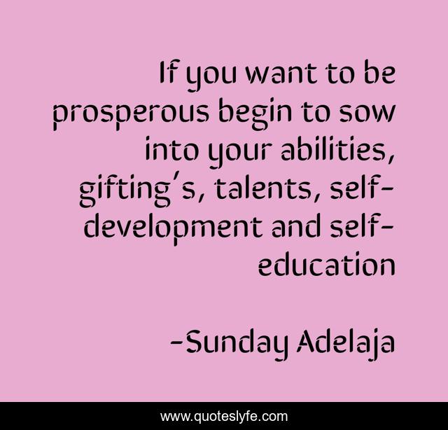 This page presents the quote "If you want to be prosperous begin to sow into your abilities, gifting’s, talents, self-development and self-education". Author of this quote is Sunday Adelaja. This quote is about prosperity, abilities, prosperous, self-education, self-development, gifting-s, talents, sow,.