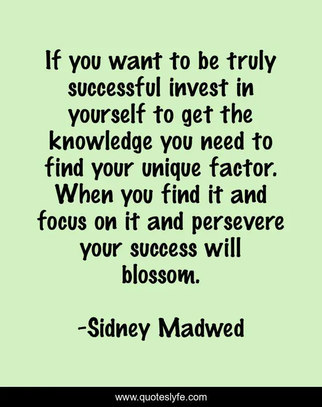 This page presents the quote "If you want to be truly successful invest in yourself to get the knowledge you need to find your unique factor. When you find it and focus on it and persevere your success will blossom.". Author of this quote is Sidney Madwed. This quote is about success, life, knowledge, value,.
