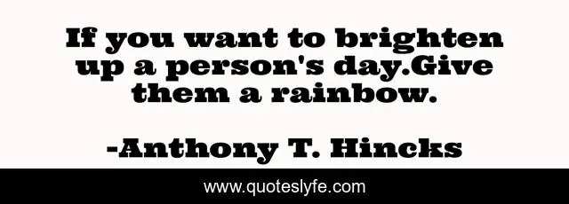 This page presents the quote "If you want to brighten up a person's day.Give them a rainbow.". Author of this quote is Anthony T. Hincks. This quote is about rainbow, brighten-up, philosophy, person, bright, day, happiness, happy,.