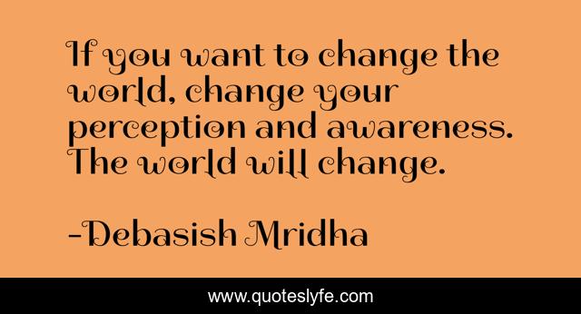 This page presents the quote "If you want to change the world, change your perception and awareness. The world will change.". Author of this quote is Debasish Mridha. This quote is about life, love, knowledge, inspirational, intelligence, philosophy, wisdom, quotes, affection,.