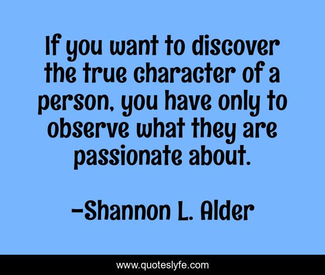 This page presents the quote "If you want to discover the true character of a person, you have only to observe what they are passionate about.". Author of this quote is Shannon L. Alder. This quote is about interests, viewpoint, character, soul, judgement, true-self, reputation, passionate, beliefs,.
