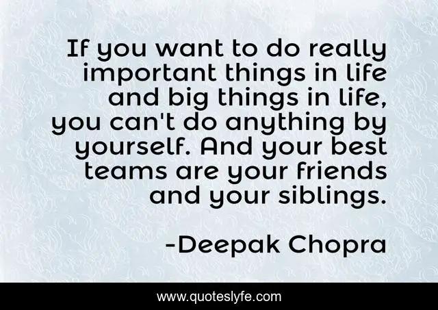 This page presents the quote "If you want to do really important things in life and big things in life, you can't do anything by yourself. And your best teams are your friends and your siblings.". Author of this quote is Deepak Chopra. This quote is about life, friends, yourself,.