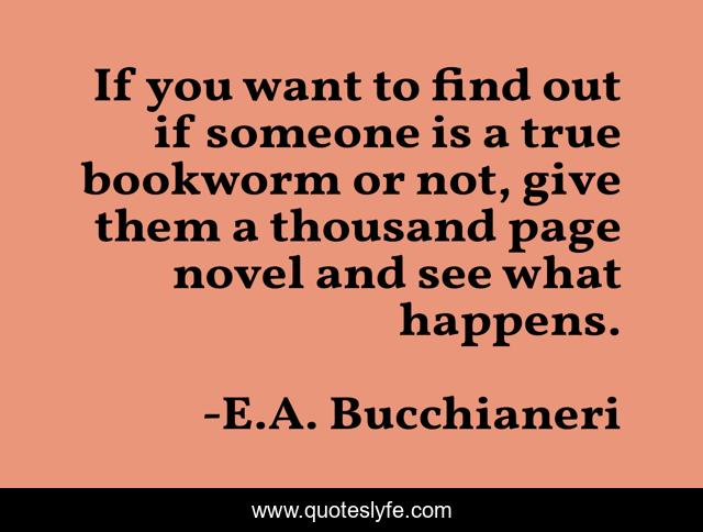 This page presents the quote "If you want to find out if someone is a true bookworm or not, give them a thousand page novel and see what happens.". Author of this quote is E.A. Bucchianeri. This quote is about book-lover, book-humor, humour, i-like-to-read, book-hoarder, bookworm, quotes, experiments, funny,.