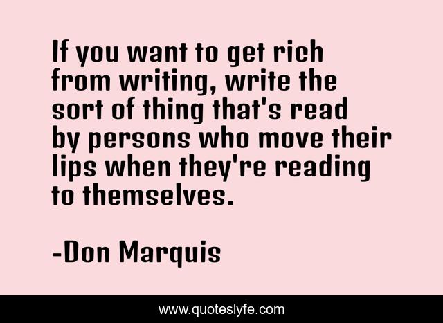 This page presents the quote "If you want to get rich from writing, write the sort of thing that's read by persons who move their lips when they're reading to themselves.". Author of this quote is Don Marquis. .