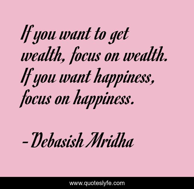 This page presents the quote "If you want to get wealth, focus on wealth. If you want happiness, focus on happiness.". Author of this quote is Debasish Mridha. This quote is about focus-on-happiness, wealth, philosophy, debasish-mridha, focus-on-wealth, quotes, debasish-mridha-md, inspirational, enthusiasm,.
