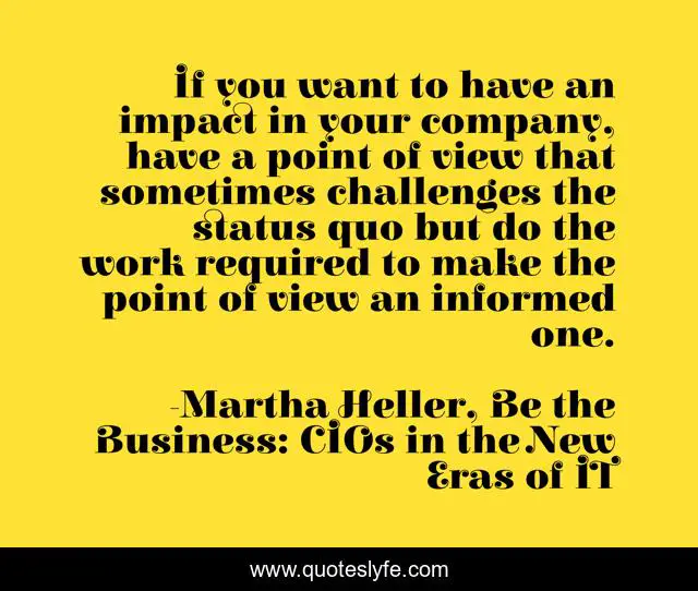 This page presents the quote "If you want to have an impact in your company, have a point of view that sometimes challenges the status quo but do the work required to make the point of view an informed one.". Author of this quote is Martha Heller, Be the Business: CIOs in the New Eras of IT. This quote is about facts, informed, humility,.