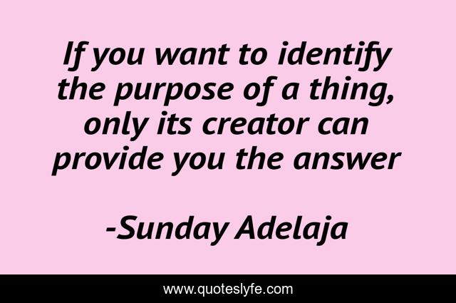 This page presents the quote "If you want to identify the purpose of a thing, only its creator can provide you the answer". Author of this quote is Sunday Adelaja. This quote is about creator, god, identification, purpose, answer, provision,.