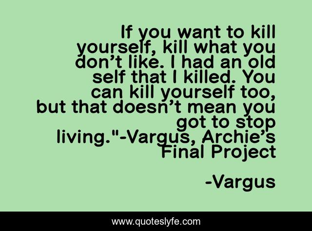This page presents the quote "If you want to kill yourself, kill what you don’t like. I had an old self that I killed. You can kill yourself too, but that doesn’t mean you got to stop living."-Vargus, Archie’s Final Project". Author of this quote is Vargus. This quote is about live, archie-s-final-project, killing,.