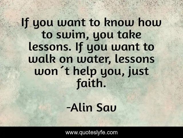 This page presents the quote "If you want to know how to swim, you take lessons. If you want to walk on water, lessons won´t help you, just faith.". Author of this quote is Alin Sav. .