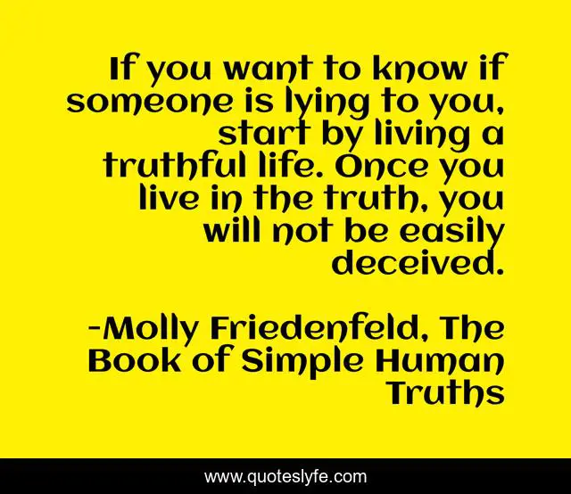 This page presents the quote "If you want to know if someone is lying to you, start by living a truthful life. Once you live in the truth, you will not be easily deceived.". Author of this quote is Molly Friedenfeld, The Book of Simple Human Truths. This quote is about love, inspirational, joy, peace, simple-life, wisdom, truth, enthusiasm, inspiration,.