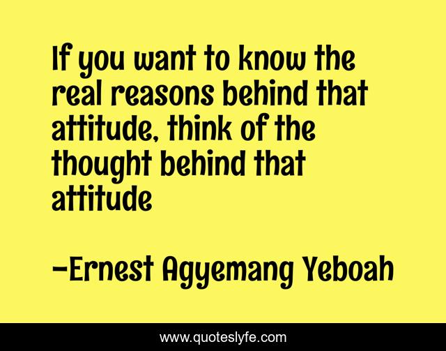 This page presents the quote "If you want to know the real reasons behind that attitude, think of the thought behind that attitude". Author of this quote is Ernest Agyemang Yeboah. This quote is about child-abuse, wrong-doings, love, behaviour, work-ethic, guilty-conscience, attitude, why-bad-attitude, child-upringing,.