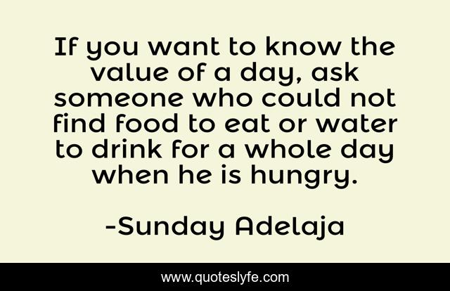 This page presents the quote "If you want to know the value of a day, ask someone who could not find food to eat or water to drink for a whole day when he is hungry.". Author of this quote is Sunday Adelaja. This quote is about hungry, value,.