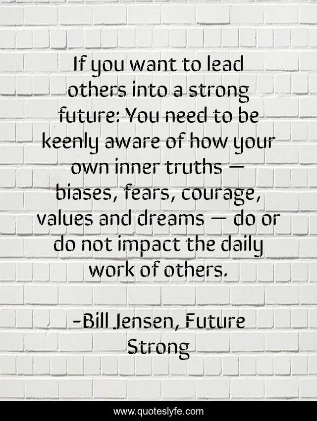 This page presents the quote "If you want to lead others into a strong future: You need to be keenly aware of how your own inner truths — biases, fears, courage, values and dreams — do or do not impact the daily work of others.". Author of this quote is Bill Jensen, Future Strong. This quote is about enthusiasm, future, leadership, inspirational, self-help,.
