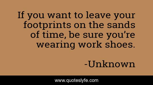 This page presents the quote "If you want to leave your footprints on the sands of time, be sure you’re wearing work shoes.". Author of this quote is Unknown. This quote is about lifetime-version, motivate, inspire, action-handbook, motivational-inspirational, inspirational-living, motivational, motivational-living, motivation,.