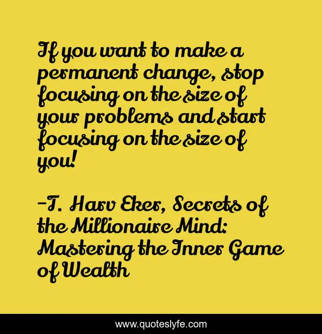 This page presents the quote "If you want to make a permanent change, stop focusing on the size of your problems and start focusing on the size of you!". Author of this quote is T. Harv Eker, Secrets of the Millionaire Mind: Mastering the Inner Game of Wealth. This quote is about spiritual-growth, millionaire, wealthy,.